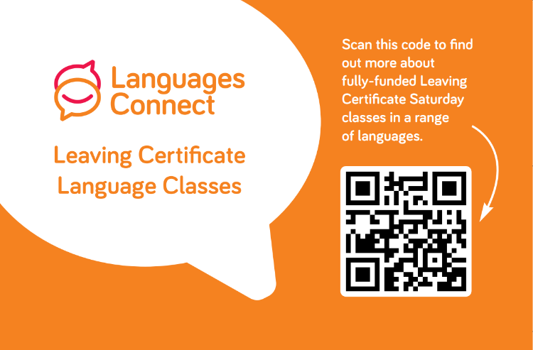 Guidance Counsellors are invited to share these cards with students who may be interested in studying a language outside their school’s curriculum. Each card features a QR code which students can scan to access further information and register directly for fully funded Saturday Leaving Certificate language classes.
